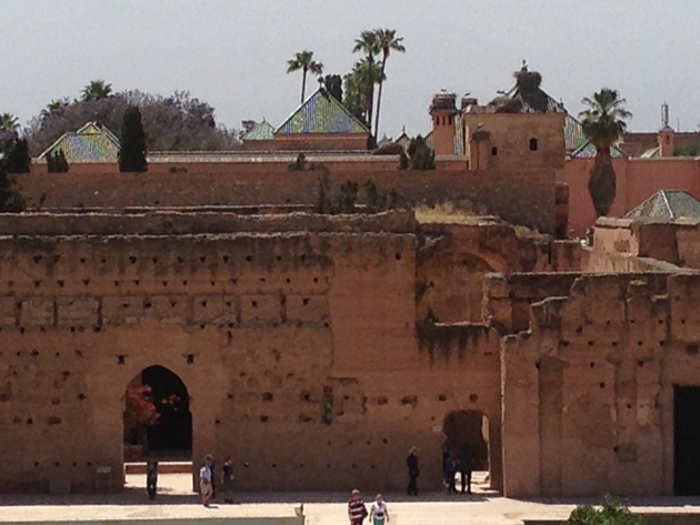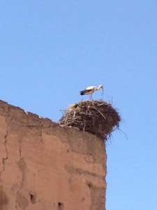 From guide books and Googling I’ve learned some of their beliefs. Moroccans believe that storks bring good luck and happiness and a nest on the roof of your home brings good luck. According to the Berber belief storks are humans turned into birds. Because the storks migrate from Europe to Africa and remain in couples who return to the same nests, they have come to symbolize strength, prosperity and love. Apparently it is a punishable offence to harm a stork or its nest. I read in one place that the punishment is a three month prison sentence, but I have not confirmed this. Nevertheless, the storks are ubiquitous in Marrakech, their long beaks and scraggly legs hopping around the tops of their gigantic nests.