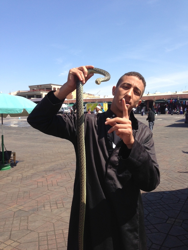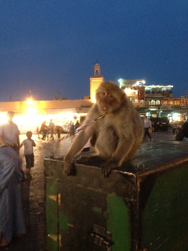 Marrakech’s main square the Jemaa el Fna is filled with various types of animals. I thought this monkey on a chain with its trainer seemed a bit sad.