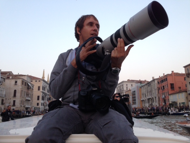 AP Photographer Andrew Medichini on the roof of a water taxi taking pictures of the George Clooney parade down the Grand Canal. September 27, 2014. Photo by Trisha Thomas