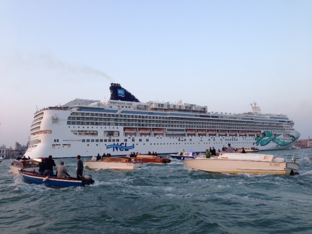 A gigantic cruise ship, towering higher than the city of Venice blocked the way.  George’s taxis screeched to a halt, or whatever boats do when they half to stop suddenly and it was a field day for the paparazzi.  We all caught up to George’s taxi, making the area choppy withal the waves.  By that time we were all shouting “George, George, George!!”  I must say, he is a natural—he remained cool, calm, collected, waved, smiled, and chatted with his guests.  From high above the passengers on the cruise ship waved and took pictures of all of us. Finally the cruise ship passed we all charged forward and then there was a loud horn – a Venetian ferry boat blocked our way again.  By this time it seemed like a floating circus.