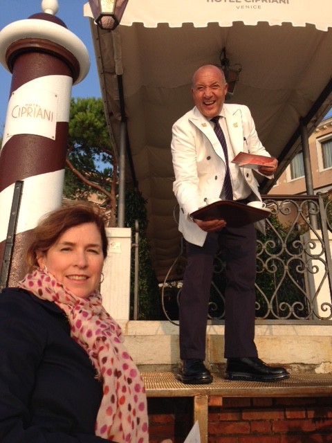 Trisha Thomas in water taxi outside Cipriani Hotel in Venice. September 27, 2014