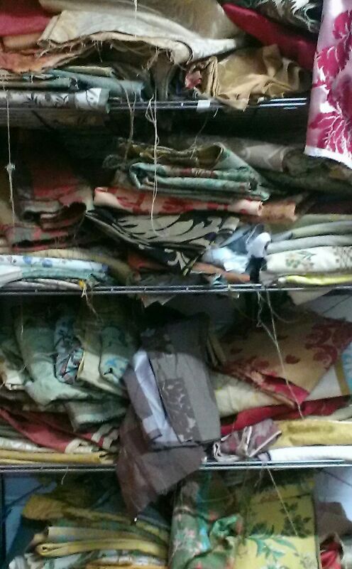 In her studio it was hard to miss the shelves overflowing with pieces of damask silk fabric.
