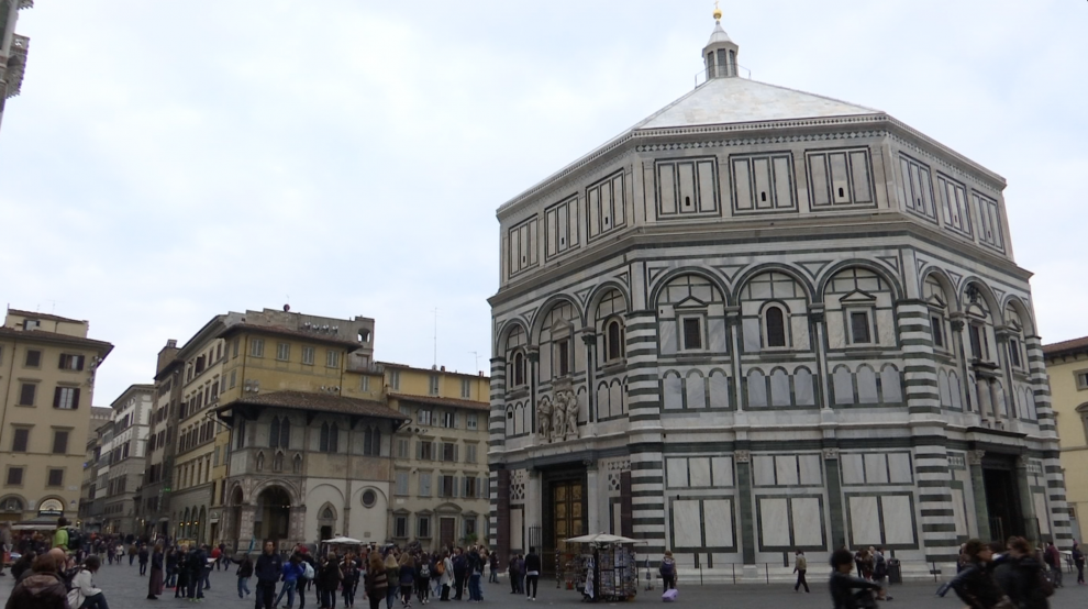 Florentine artist, sculptor, goldsmith and architect Lorenzo Ghiberti took over 20 years to make the bronze doors completing them in 1424. The doors have 28 panels, most with scenes from the New Testament. Each panel is a bronze engraving gilded in 24-karat gold. Over the years millions of tourists have stopped to stare at the doors, but in recent years the once magnificent panels have become grime-covered and difficult to appreciate.